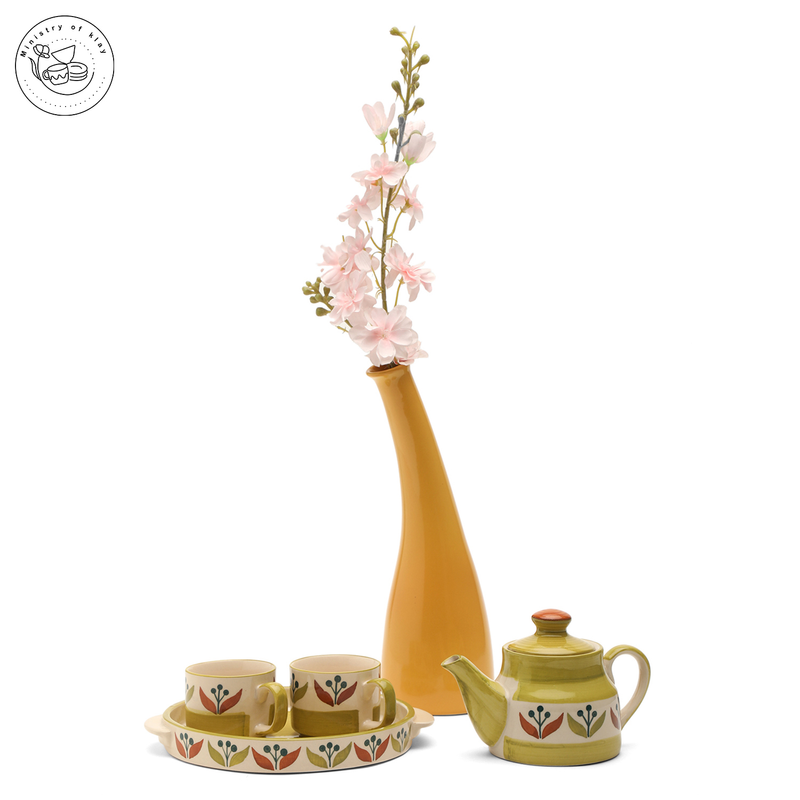 Ministry Of Klay Olive Green Hand Painted Ceramic Morning Tea Set – 2 Tea Cups (150ml) | 1 Tray | 1 Kettle (250ml) / Microwave Safe, Set of 4.