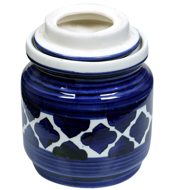 RAJ Royal Hand Painted Ceramic Cornichon Storage Jar for Pickle, Dry items White Pottery Dry Food Storage Container Donga with Lid For Kitchen, Home – Multipurpose Storage Canister (Blue) – 500 Grams